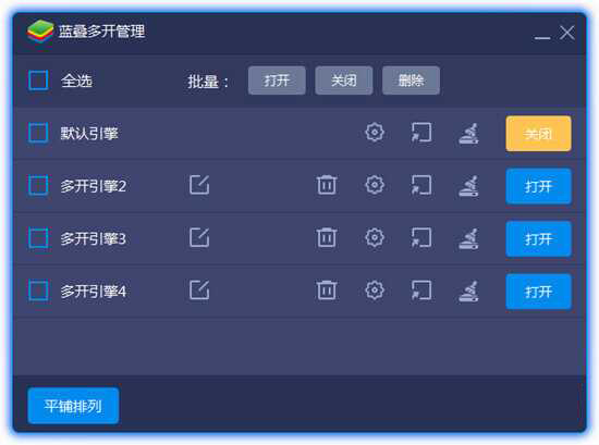 之后就会在多开管理中显示多开的引擎,并将其开启。最后只需要在首页的游戏图标右上角点击下拉框,或者首页---多开图标---运行---多开引擎1即可,删除同理。不过依照各位的电脑配置决定,在这里建议大家多开3个是最保守的。