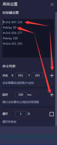 4、设置完成后,按下Ctrl键,点击(647,224)这个坐标后,延时50ms,接着点击(654,277),延时100ms后,再次点击(651,293),也就是说按下Ctrl键完成3个点击动作;