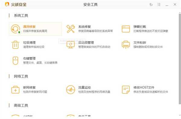 扩展工具为您提供了火绒剑、修改HOST文件、右键管理、垃圾清理、文件粉碎、弹窗拦截、启动项管理、网络流量八大扩展工具,实用、方便,扩展工具不是默认捆绑安装,未加载前不占电脑内存,只有在您需要并亲自点击时,才会下载安装。