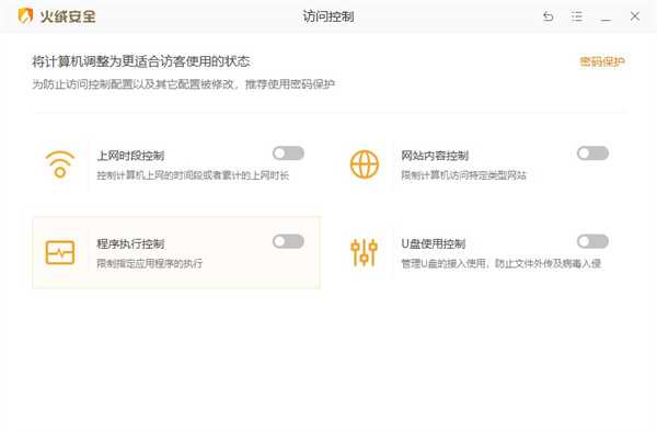 火绒安全软件5.0提供家长控制功能,帮助家长保护、管教孩子,在孩子使用电脑时对孩子的上网行为进行管控。家长控制功能从上网时段控制、程序执行控制、网站内容控制、设备使用控制四个方面保护孩子。