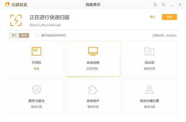病毒查杀是火绒安全软件5.0的基础功能。用户主动扫描即可检测电脑中是否存在病毒、木马等威胁。当用户使用病毒查杀功能,将通过自主研发的新一代反病毒引擎高效扫描系统文件,及时发现病毒、木马,并高效处理清除相关威胁。