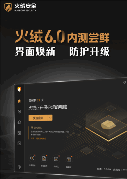 火绒安全6.0是由北京火绒网络科技有限公司出品的一款轻量型强悍轻巧干净的反病毒利器。它是一款国内为数不多的游戏国产杀毒软件,深度融合反病毒+主动防御+防火墙强悍、轻巧、干净。软件主打专业尽职、极致低调、只为巩固安全防线理念,与国内某些知名的免费杀毒软件比较,无广告,无流氓这个绝对是特色,简单易用,一键安装,大众用户即可获得安全防护,软件没有广告推广性质的弹窗和捆绑等能够打扰到用户的行为,不会影响用户日常的办公和游戏等,而且软件杀、防、管、控样样精通,通过该软件,就能一键的完成病毒的扫描和查杀,能够有效的预防病毒、木马、流氓软件、恶意网站等所有对客户端造成危险的病毒程序软件入侵,可以自定义电脑的使用权限,让您可以充分的控制自己的电脑不被他人随意使用,为您提供系统、网络管理,让用户就可以更好的使用电脑,不用担心电脑的安全问题。
