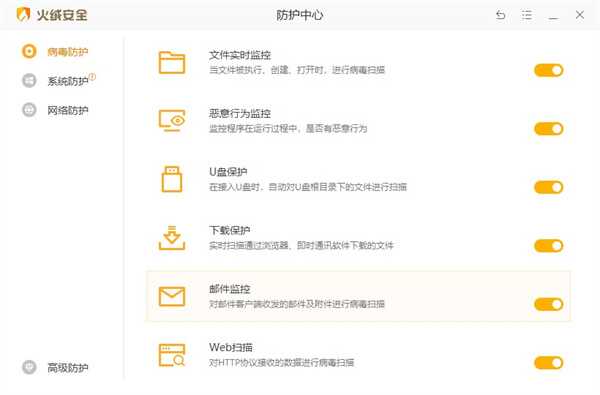 防护中心设置了多达14类防护开关,只需点击开关,即可方便、快捷的开启或关闭相应防护功能。当发现威胁动作触发已经开启的防护项目时,将精准拦截威胁,避免电脑受到侵害。