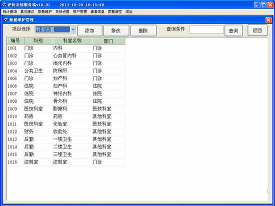 点击菜单中的《数据维护》选项,可进行科室设置、医师设置、及评价内容的设置,这里可以对《医师设置》《科室设置》《评价内容设置》,在项目选择下拉中选要进行设置的内容,然后点击《添加》按钮,填写好信息之后点击确定,如果有写入的不正确,可以直接在上面修改,然后点击《修改》按钮。