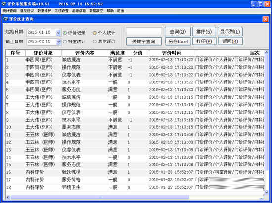 6、满意分值、一般分值、不满意分值:对医院整体评价的一个量化过程,有利于管理人员的统计,更直观的体现了医院整体形象。
