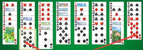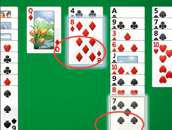 4、而下面的牌组只有颜色交替并且需要按照从大小的顺序排列,才可以移动牌,比如这样。