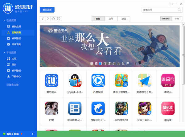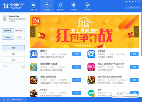 无论你是否越狱都能通过爱思助手下载应用、游戏,无需帐号,免费高速下载,海量正版资源应有尽有;更有个性铃声、壁纸免费下载。
