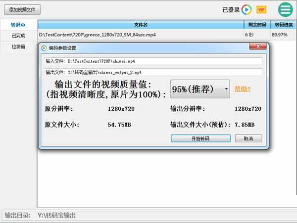 (2) 选择转码的<视频质量值>, 点击<开始转码>