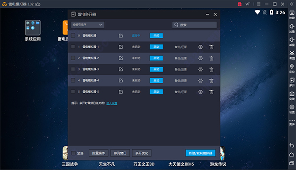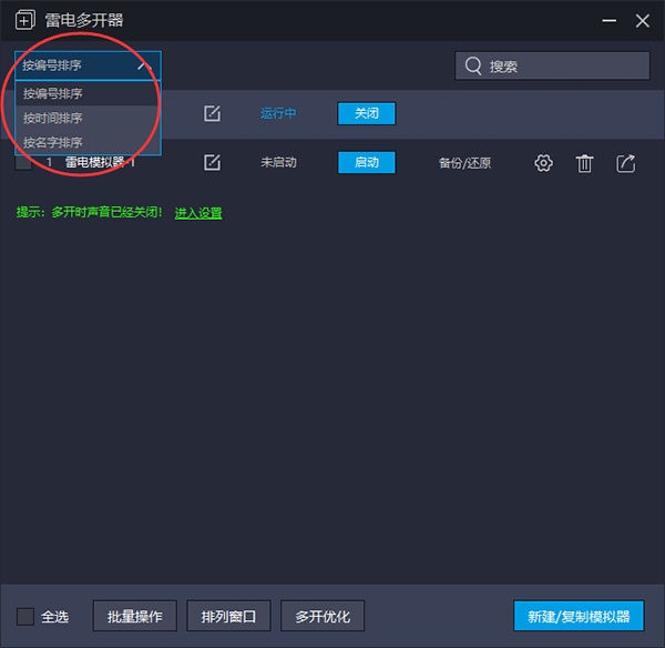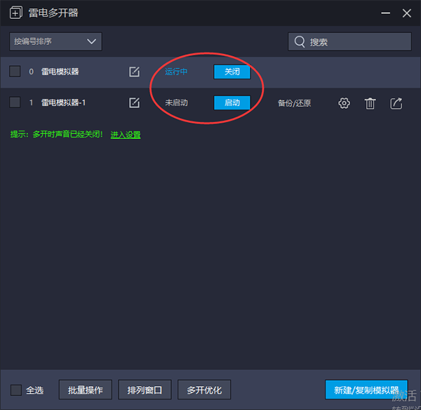可以对点击的模拟器进行备份,或者是还原操作。处于启动的状态的模拟器是无法在雷电多开器界面创建快捷方式,设置,删除,备份还原等操作的。
