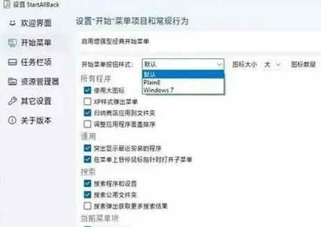 StartAllBack 支持复原开始菜单,打开“开始菜单-启用增强型经典开始菜单”后,即可将开始菜单恢复回以前的样子。设置界面与同类软件类似,同样提供了默认、Plain8、Windows7 三种外观样式。同时这里的可选项也比较丰富,基本可以还原以前的习惯。