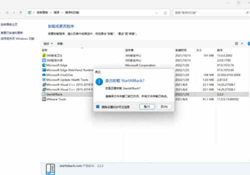进入控制面板–程序和功能,找到StartAllBack并点击卸载。也可以使用其他软件进行卸载。总之不建议直接删除安装文件夹。