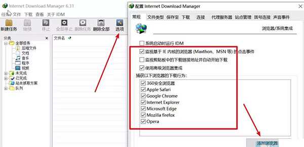 默认情况下,在成功安装IDM后,直接点击这里的选项,会弹出【常规设置】,一般情况下直接保持默认的配置即可,如果你使用的是比较小众的浏览器,你可以点击这里的【添加浏览器】,选中你使用的浏览器.exe文件,添加进来即可: