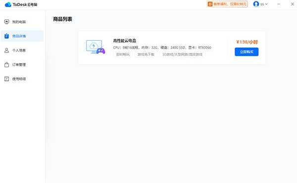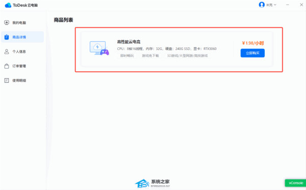 在云电脑主页左侧找到商品详情,点击即可进入下单界面。