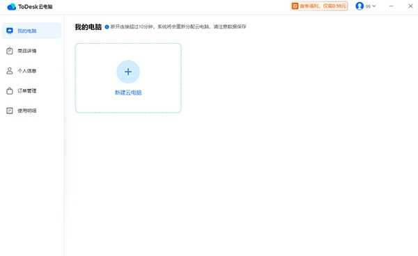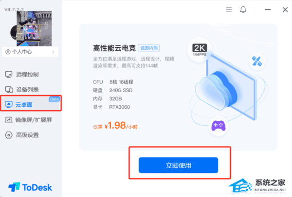 安装云电脑完毕后,在电脑页面打开ToDesk软件,在左侧找到云电脑,点击【立即使用】进入云电脑主页。