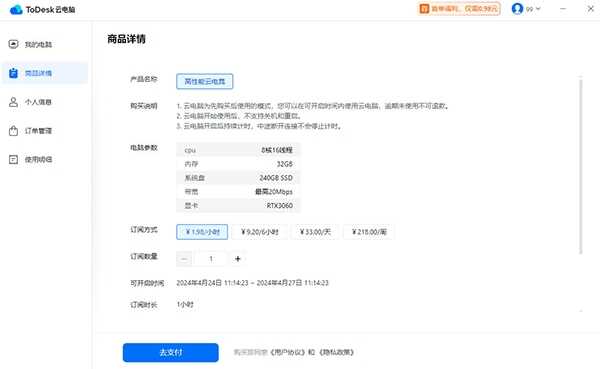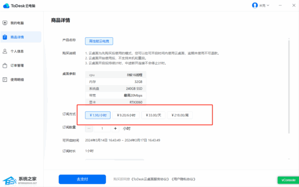 目前ToDesk云电脑支持按小时购买,按天购买和按周购买,选择想要的套餐,点击【去支付】完成订单即可。