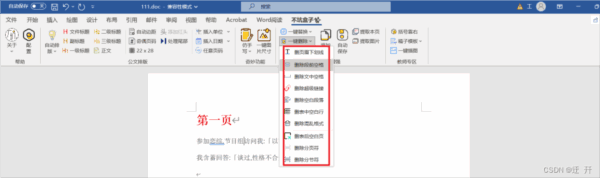 不坑盒子一键删除里功能挺多的,可以删除页眉下划线、删除段前空格、删除文中空格、删除超级链接、删除空白页等等。