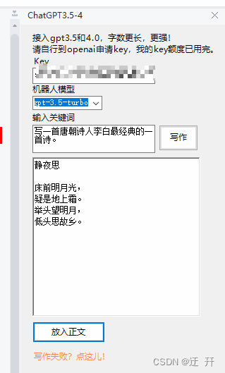 当然这个使用次数也是有限制的。但也提供了使用自己 key的入口, 当次数用完后 会出现弹窗 只需填入 key 再输入关键词 最后点击写作即可。