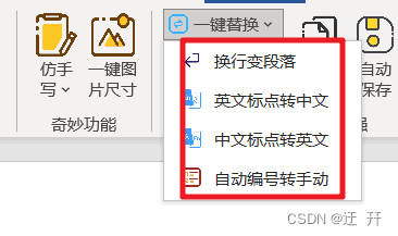 一键替换里,可以换行变段落、中英文标点互转、自动编号转手动。
