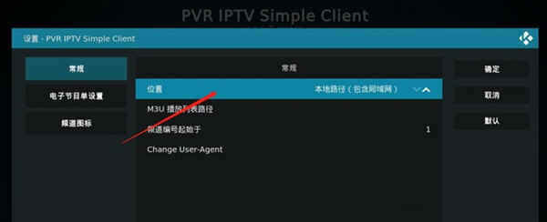 四、在【PVP IPTV Simple Client】插件中点击设置,在常规选项中可以看到“位置”选择本地路径(包含局域网)接着点击位置下方的M3U播放列表路径,点击之后就能看到我们刚才插入的U盘,点击进入U盘,找到我们放入U盘的直播源文件,点击确定就已经添加完成了。