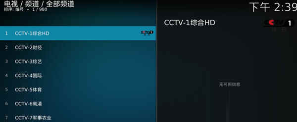 六、重启Kodi软件,在首页找到【电视选项】,点击【频道】就能看到我们刚刚插入电视的直播源了,点击即可观看。