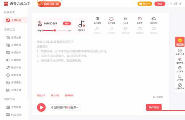 素材丰富:语音合成助手拥有海量样音文案模板,优质背景音乐,打造专属于你的配音效果