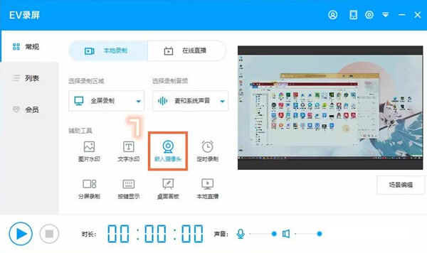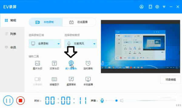 2、点击右侧的常规,在辅助工具中选择嵌入摄像头(确保电脑中有摄像头设备)。