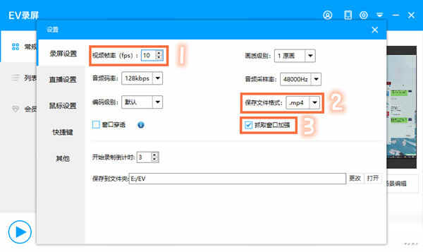 1、打开EV录屏,在开始录制之前,首先点击右上角小齿轮进入设置界面,将录屏参数里的视频帧率、保存文件格式进行调整。