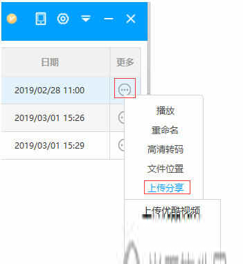 2、点击视频最后边的“...”按钮即可呼出一个菜单栏,在菜单栏中点击“上传分享”即可进行视频的导出了;
