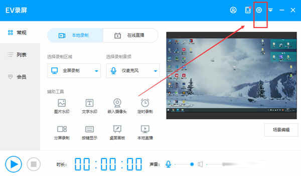 1、首先打开EV录屏软件,然后点击页面右上角的设置图标。