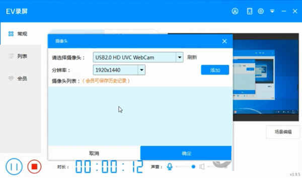 3、之后就会自动弹出摄像头的设置画面,选择摄像头(如果有多个摄像头设备的话),并调整分辨率。