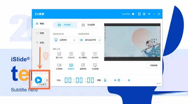 6、所有的设置工作做好后,打开需要录制的PPT课件,再点击EV录屏左下角的开始键,就能行录制了。如第二张图所示,开启录制后,EV录屏的界面会自动隐藏,我们可以通过键盘快捷键来停止录制。