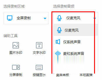 2、接着选择录制区域,包括了全屏、选区、摄像头等,以及选择音频录制方式,包括了麦克风声音、系统声音、麦和系统声音等;