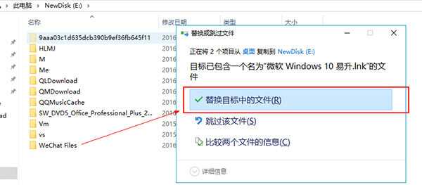 4、用迁移过来的WeChat files 覆盖至新电脑B的WeChat Files. 选择替换目标中的文件;