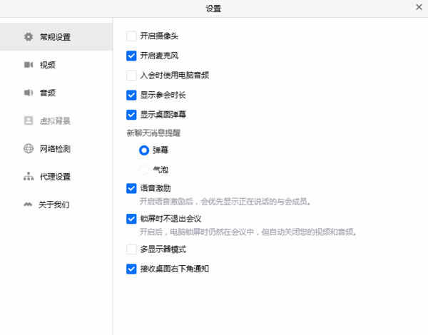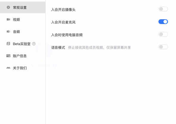 点击该按钮,即可唤出设置窗口,您可以在该窗口进行设备信息检测,查看您的摄像头、麦克风、扬声器是否被识别,同时可进入Beta实验室,体验最新黑科技