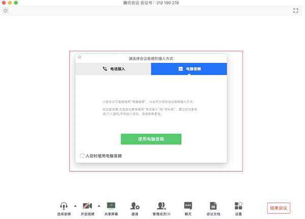 1、当您进入腾讯会议中后,会提示您选择音频接入方式;