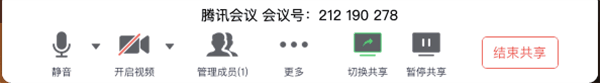 腾讯会议中,当您共享屏幕后,屏幕共享菜单将会在3s后进入沉浸模式,自动隐藏在顶部,您需要将鼠标放置桌面上方即可将其唤出