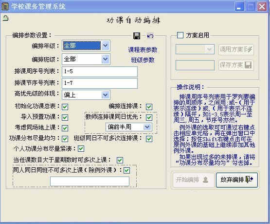 【课程管理】主要用于功课编排,包括【自动排课】、【人工调整】、【临时调课】、【课时数统计】等功能。其中【自动排课】考虑了连排课、同场地上课、功课优先级、班级同日连排课、教师同日连排课等因素,更可以分班分时间段进行多次排课;【课程调整】则用直观的颜色来实时显示可调课,方便教务人员调课;对于通过【临时调课】调整了功课的教师可以用以下三种方式通知其本人----网络查看、打印调课单、发送短信(需短信猫支持)。
