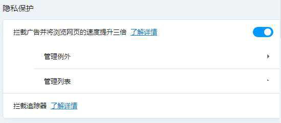 当然了你也可以进入浏览器的设置页面中,在隐私保护中,勾选拦截广告即可,这样打开的所有网页都能够进行广告拦截,你可以自行添加信任不拦截的网站。