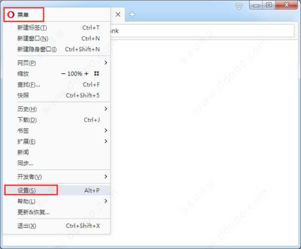 1、首先我们打开Opera浏览器,然后在其左上角的“菜单”中打开“设置”;