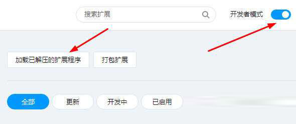 然后点击扩展图标前往插件管理页面,点击右上角的【开发者模式】,并选择加载已解压的扩展程序,或者直接将CRX格式的插件拖入到浏览器中即可安装。