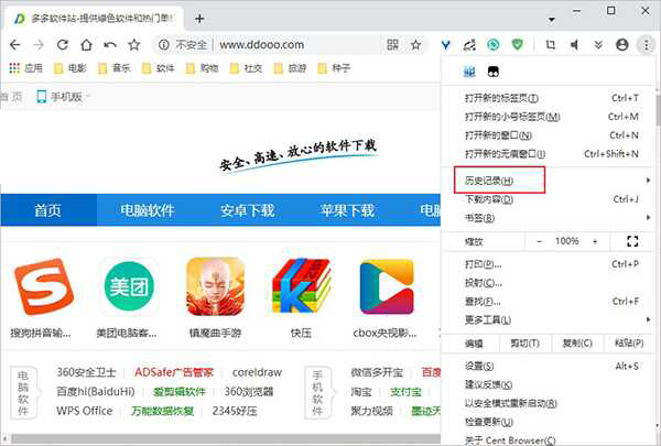 1、打开浏览器,点击右上角的选项按钮,找到历史记录;