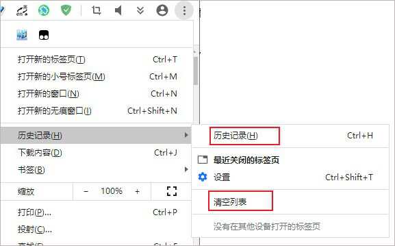 2、把鼠标放在历史记录上,将会弹出一个小小的界面,点击清空列表或是进入历史记录里,单个清除你想要清除的访问页面;