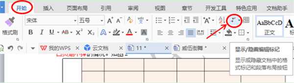 4、首先,我们要知道问题究竟出现在了哪里。打开文档,我们选择开始菜单栏下的显示/隐藏编辑标记工具栏,如下图所示: