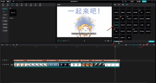 二、完成字幕的添加后,在时间轴中拖动鼠标,左键选中全部字幕,在右上方点击【朗读】