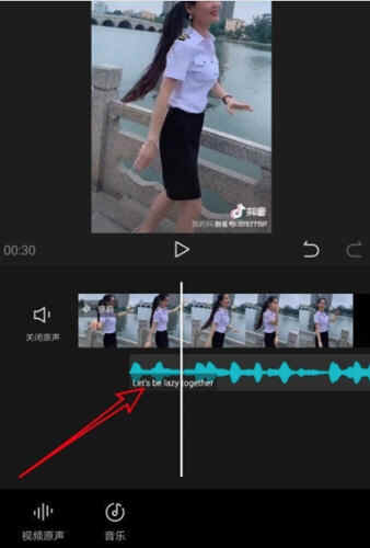2、进入到视频编辑界面之后,我们点击选中视频素材,这时候即可在下方出现一个功能列表,在列表中选择“音乐”。
