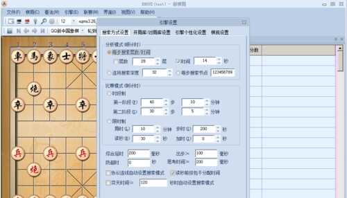 2.上面的图中 左边是当前的棋局,而右边的思考细节则是当前计算机思考的当前最顽强的每一步的分数,这个分数一般是针对红方,如果分数越高,则表示当前局面红方的优势是越大的。接着我们菜单上面的引擎,打开引擎设置,显示出下面的这个图。