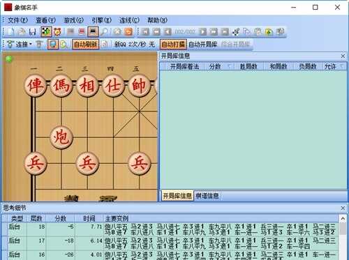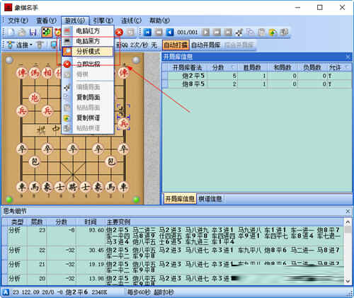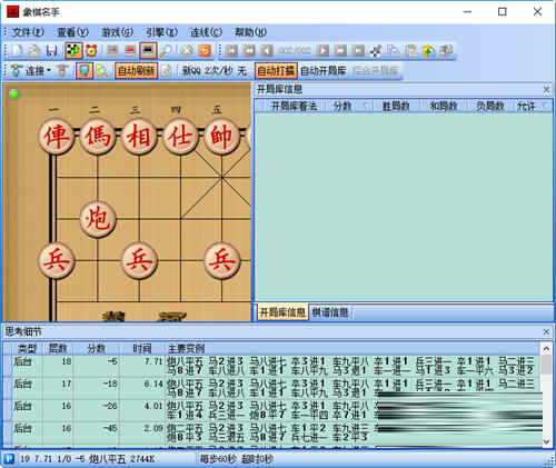 2、棋谱分析:象棋名手软件支持标准棋谱格式PGN的中国象棋棋谱文件,可以方便的保存和载入棋谱,使用软件的分析模式对棋谱进行分析研究,找出特定局面下的最佳招法,提高自己的棋力。