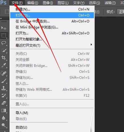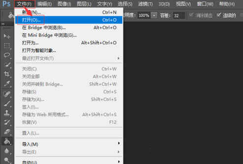 1、打开pscs6,找到并点击“文件”,在弹出的窗口中点击“打开”;