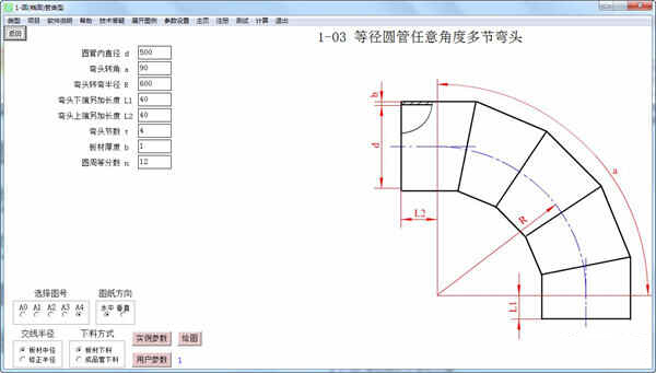 本类型为矩形过渡到圆形的连接管构件,包括各种形式的矩形(含正方形,下同)过渡到圆形、椭圆形、长圆形的连接管构件,圆形过渡到长圆形的连接管构件,还有矩形过渡到圆形、圆形过渡到矩形的裤形三通管构件等14种形式。构件品种齐全,各个构件内的各部尺寸、倾斜角度、偏心量可在一定范围内任意输入。内中附有立体图、构件示意图、实例参数、展开示意图以及详细的说明,界面友好,操作方便。