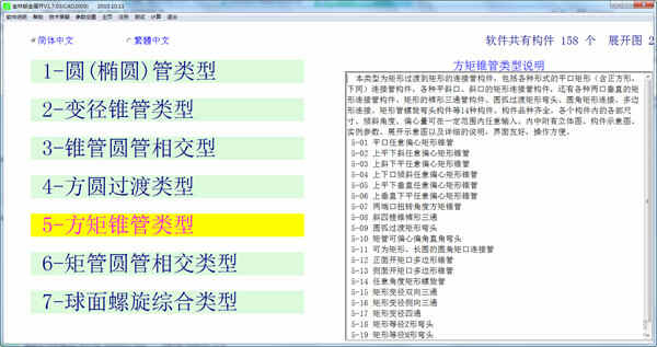 本类型为矩形管、四棱锥管与圆管、圆锥管连接的构件,包括矩形管相交圆管、四棱锥管相交圆管构件,矩形管相交正圆锥管、斜圆锥管构件,四棱锥管相交正圆锥管构件,圆管直交四棱锥管构件等6种形式。构件品种齐全,各个构件内的各部尺寸、倾斜角度、偏心量可在一定范围内任意输入。内中附有立体图、构件示意图、实例参数、展开示意图以及详细的说明,界面友好,操作方便